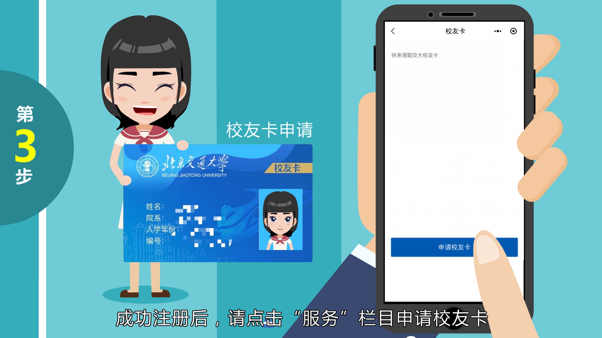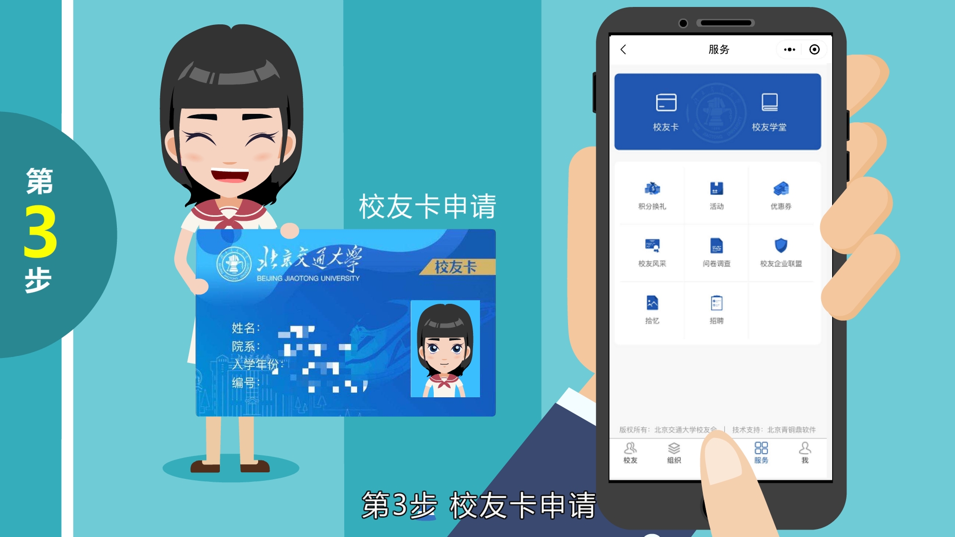 成功注册后,请点击“服务”栏目申请校友卡