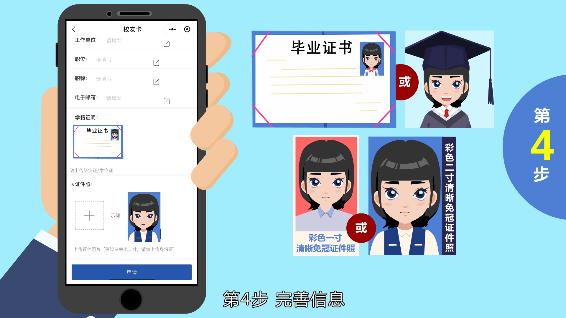 上传毕业证或学位证照片,以及彩色一寸或二寸清晰免冠证件照。
